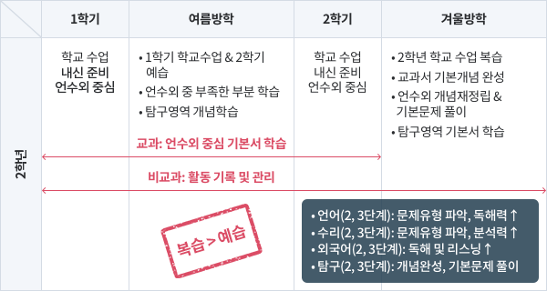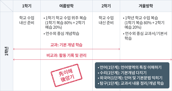 ¿¹½Àº¸´Ù´Â º¹½À À§ÁÖ·Î °øºÎÇØ¾ß ÇÕ´Ï´Ù. ±³°ú ¹× ¼ö´ÉÀº ¾ð¼ö¿Ü Áß½ÉÀÇ ±âº»¼­ ÇнÀÀÌ ÀÌ·ç¾îÁ®¾ß ÇÕ´Ï´Ù. ¿µ¿ªº°·Î »ìÆìº¸¸é ¾ð¾î´Â ¹®Á¦À¯Çü ÆÄ¾Ç ¹× µ¶ÇØ·ÂÀ» ³ôÀÌ´Â µ¥ ÁÖ·ÂÇϰí, ¼ö¸®´Â ¹®Á¦À¯Çü ÆÄ¾Ç ¹× ºÐ¼®·ÂÀ» Çâ»ó½Ã۴µ¥ ÁÖ·ÂÇØ¾ß ÇÕ´Ï´Ù ±×¸®°í ¿Ü±¹¾î´Â µ¶ÇØ ¹× ¸®½º´× ½Ç·ÂÀ» Ű¿ìµµ·Ï Çϰí, ޱ¸´Â °³³ä¿Ï¼º°ú ±âº»¹®Á¦ Ç®ÀÌ¿¡ ÁßÁ¡À» µÎ¾î¾ß ÇÕ´Ï´Ù. ±×¸®°í ÀÌ ½Ã±â¿¡ ºñ±³°ú´Â 1Çг⠶§¿Í ¸¶Âù°¡Áö·Î Ȱµ¿±â·Ï ¹× °ü¸®¿¡ ÁýÁßÇØ¾ß ÇÕ´Ï´Ù.
