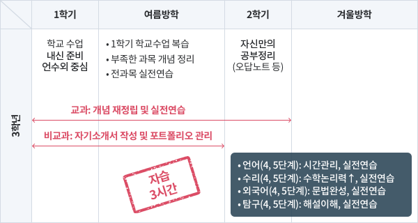ÀÚ½ÅÀÇ ÇнÀ½Ã°£À» ÃÖ´ë·Î È®º¸ÇÏ´Â °ÍÀÌ Áß¿äÇÕ´Ï´Ù. Àû¾îµµ 3½Ã°£ Á¤µµ´Â ÀÚ½ÅÀÇ °øºÎ½Ã°£À¸·Î È®º¸Çϵµ·Ï ÇØ¾ß ÇÕ´Ï´Ù. ¿µ¿ªº°·Î »ìÆìº¸¸é ¾ð¾î´Â ½ÇÀü¿¬½ÀÀ» ÅëÇØ ½Ã°£°ü¸® ´É·ÂÀ» Çâ»ó½Ã۰í, ¼ö¸®´Â ¼öÇÐ³í¸®·Â Çâ»óÀ» À§ÇØ ½ÇÀü¿¬½ÀÀ» ¹Ýº¹ÇØ¾ß ÇÕ´Ï´Ù. ¿Ü±¹¾î´Â ¹®¹ý¿Ï¼º°ú ½ÇÀü¿¬½À¿¡ ½Ã°£À» ÅõÀÚÇϰí, ޱ¸´Â ÇØ¼³À» ÀÌÇØÇÏ°í ½ÇÀü¿¬½ÀÀ» ÅëÇØ ½ÇÀü°¨°¢À» °®µµ·Ï ÇØ¾ß ÇÕ´Ï´Ù. ¶ÇÇÑ, ÀÌ ½Ã±â¿¡ ºñ±³°ú´Â ÀÚ±â¼Ò°³¼­ ÀÛ¼º ¹× Æ÷Æ®Æú¸®¿À °ü¸®¿¡ ÁßÁ¡À» µÎµµ·Ï ÇØ¾ß ÇÕ´Ï´Ù.