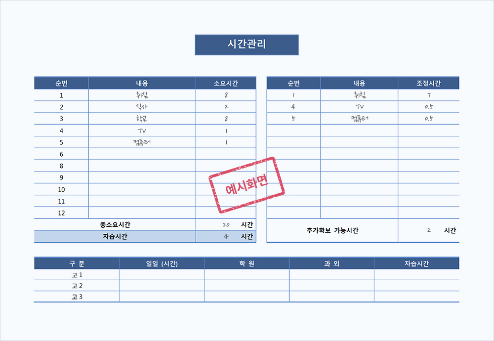 ½Ã°£°ü¸®´Â ÇнÀ´É·Â Çâ»ó Àü·«¿¡ À־ °¡Àå ±âÃÊÀûÀ¸·Î È®ÀÎÇØ ºÁ¾ß ÇÒ ºÎºÐÀÔ´Ï´Ù. ´ÙÀ½Ç¥¸¦ ÀÌ¿ëÇØ¼­ ÇöÀç ÀÚ½ÅÀÇ ÇнÀ½Ã°£À» È®ÀÎÇØ º¸°í. ÀÚ½ÅÀÌ ÇöÀç ÇнÀ À̿ܿ¡ »ç¿ëÇÏ´Â Ç׸ñ Áß¿¡¼­ Á¶Á¤ÇÒ ¼ö ÀÖ´Â ºÎºÐÀÌ ÀÖ´Ù¸é, Á¶Á¤ °¡´ÉÇÑ Ç׸ñÀ» ã¾Æ ÀÚ±âÁÖµµÇнÀ¿¡ Ȱ¿ëÇϵµ·Ï Çϱ⠹ٶø´Ï´Ù.