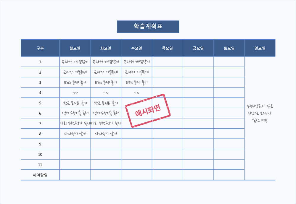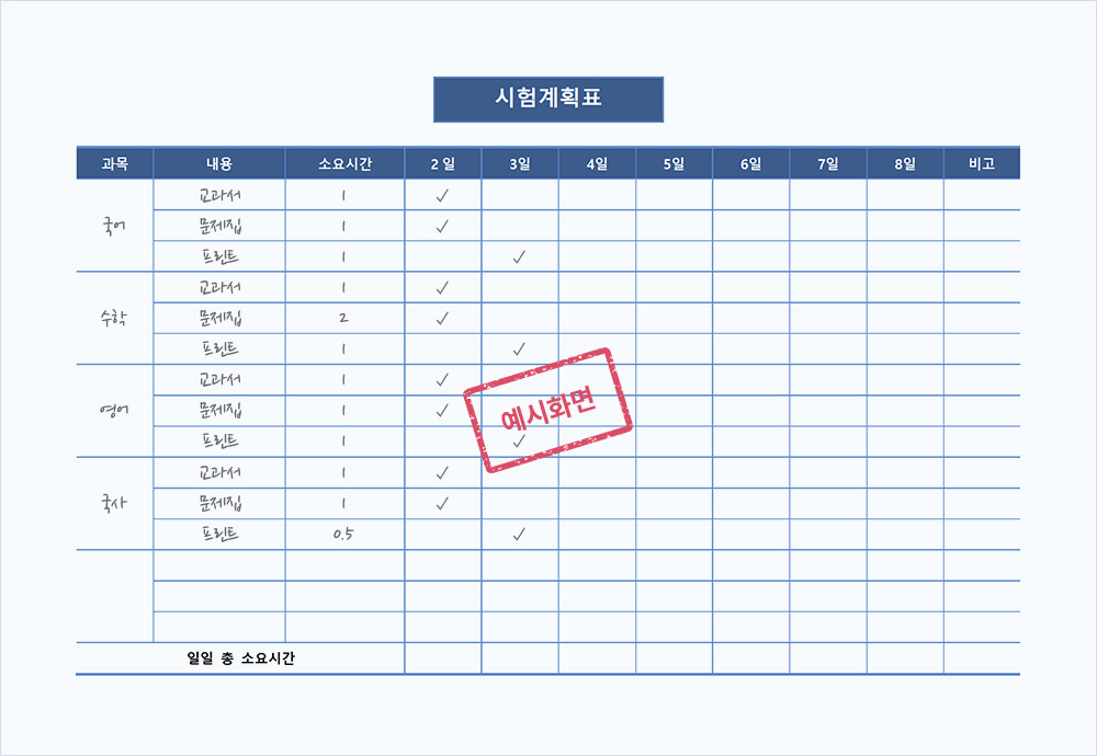 ½ÃÇè°èȹǥ ÀÛ¼º½Ã °¡Àå ¸ÕÀú ÇØ¾ß ÇÒ ÀÏÀº °øºÎ ´ë»óÀ» Á¤ÇÏ´Â °ÍÀÔ´Ï´Ù. ±¸Ã¼ÀûÀ¸·Î ¾î¶² °ú¸ñÀÇ ¾î¶² ±³À縦 »ç¿ëÇÒ °ÍÀÎÁö¸¦ °ú¸ñº°·Î ¹Ì¸® Á¤¸®ÇÕ´Ï´Ù. ¾ÆÁ÷ ½ÃÇè ¹üÀ§°¡ ³ª¿ÀÁö ¾Ê¾Ò´Ù¸é °¢°¢ÀÇ ±³Àç¿¡¼­ °øºÎÇØ¾ß ÇÒ ¹üÀ§¸¦ ³ª¶õÈ÷ ±âÀçÇÕ´Ï´Ù. ÀÛ¼º¹æ¹ýÀº ½Ã°£°ü¸® Ç¥¸¦ Âü°íÇØ¼­ °ú¸ñº°·Î ´Ü¿ø³»¿ëÀ» ÇÑ ½Ã°£ ´ÜÀ§·Î ³ª´¯´Ï´Ù. ½Ã°£´ç °øºÎÇÒ ³»¿ëÀÌ Á¤ÇØÁö¸é ³¯Â¥ º°·Î È®º¸ °¡´ÉÇÑ °øºÎ½Ã°£À» °¨¾ÈÇÏ¿© ÁÖ¿ä°ú¸ñ À§ÁÖ·Î ÀûÀýÈ÷ ¹èºÐÇϰí, ÃÖ´ëÇÑ ±¸Ã¼ÀûÀ¸·Î ¹üÀ§¸¦ ¼¼ºÐÇÏ¿© Àû¾î¾ß ÇÕ´Ï´Ù. ±×¸®°í ÁÖÀÇÇØ¾ß ÇÒ Á¡Àº ¹Ýµå½Ã 3ÀÏ Á¤µµ ÀÌ»ó Review½Ã°£À» °¡Á®¾ß ÇÑ´Ù´Â °ÍÀÔ´Ï´Ù.